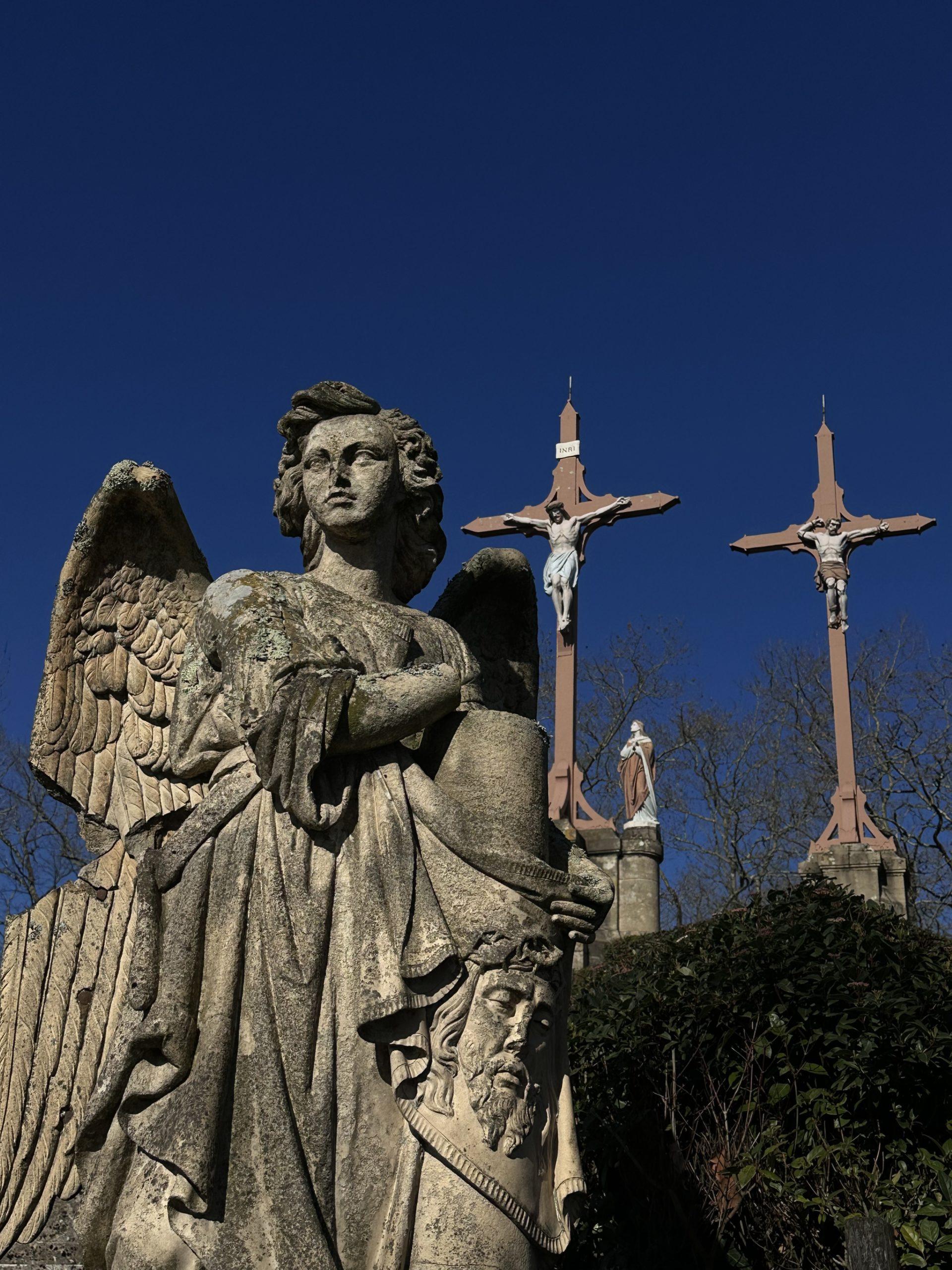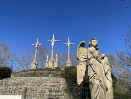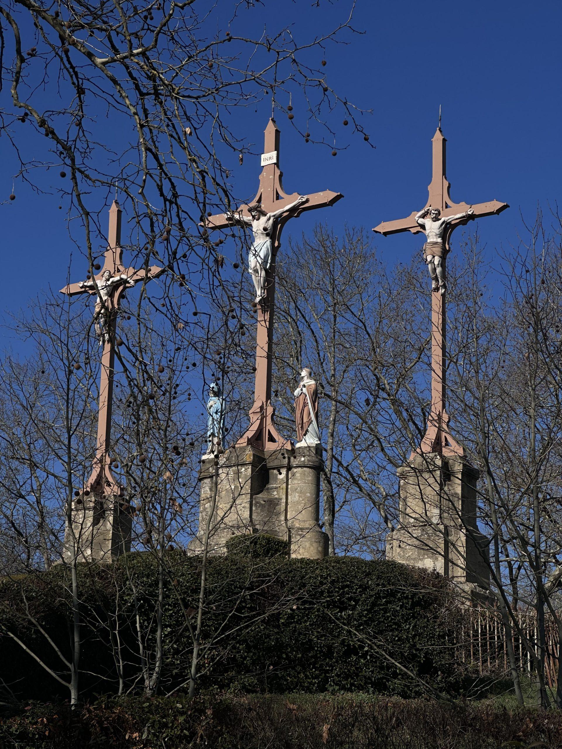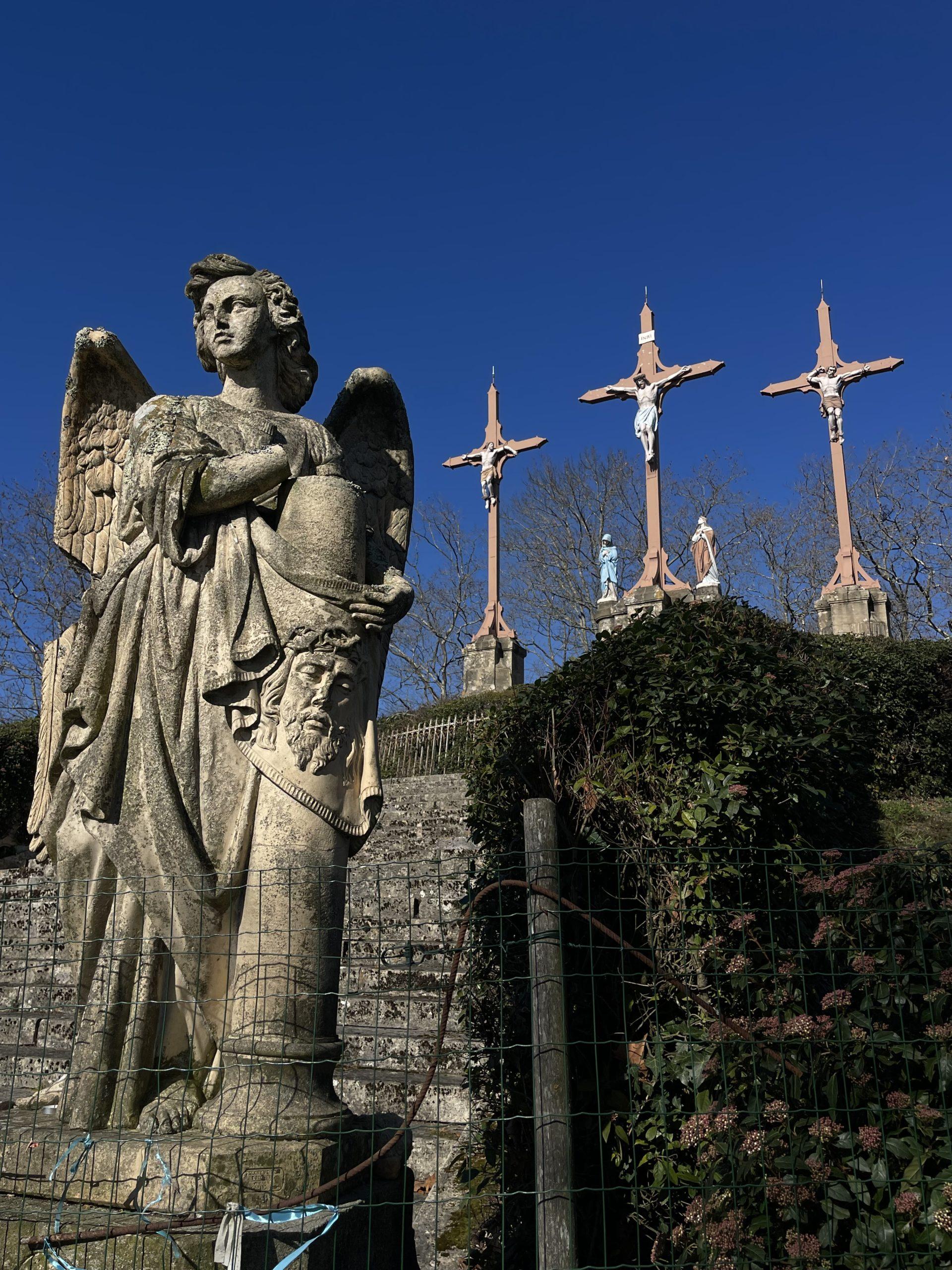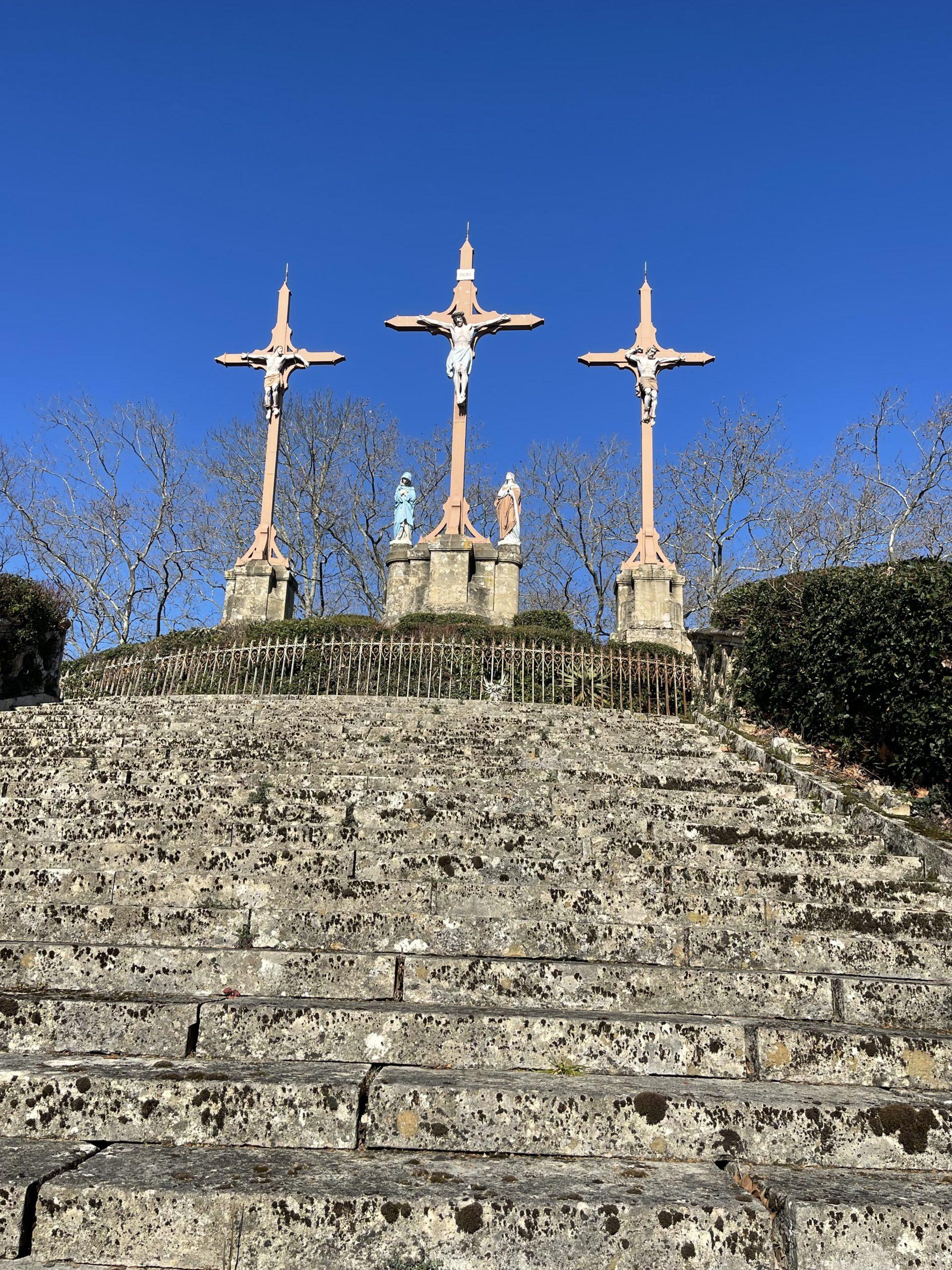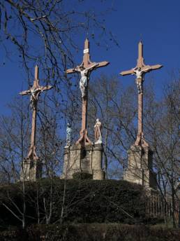 Au sommet de la colline, un calvaire monumental, faisant face au sud-ouest, présente les trois croix portant l’une le Christ et, de part et d’autre, les deux « larrons », l’ensemble se trouvant en haut d’un imposant escalier.
