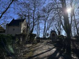 Le chemin s’élève en sinuant dans un sous-bois et est jalonné, de part et d’autre, de quatorze chapelles de style néogothique, toutes identiques quant à leur forme et leur taille, soit environ deux mètres de largeur en façade sur trois mètres de profondeur, chapelles qui représentent les quatorze stations du chemin de croix. Lesdites stations font l’objet, dans chaque chapelle, d’un bas-relief sculpté présentant la scène de la station : condamnation, charge de la croix, première chute, rencontre de la mère du Christ, etc.